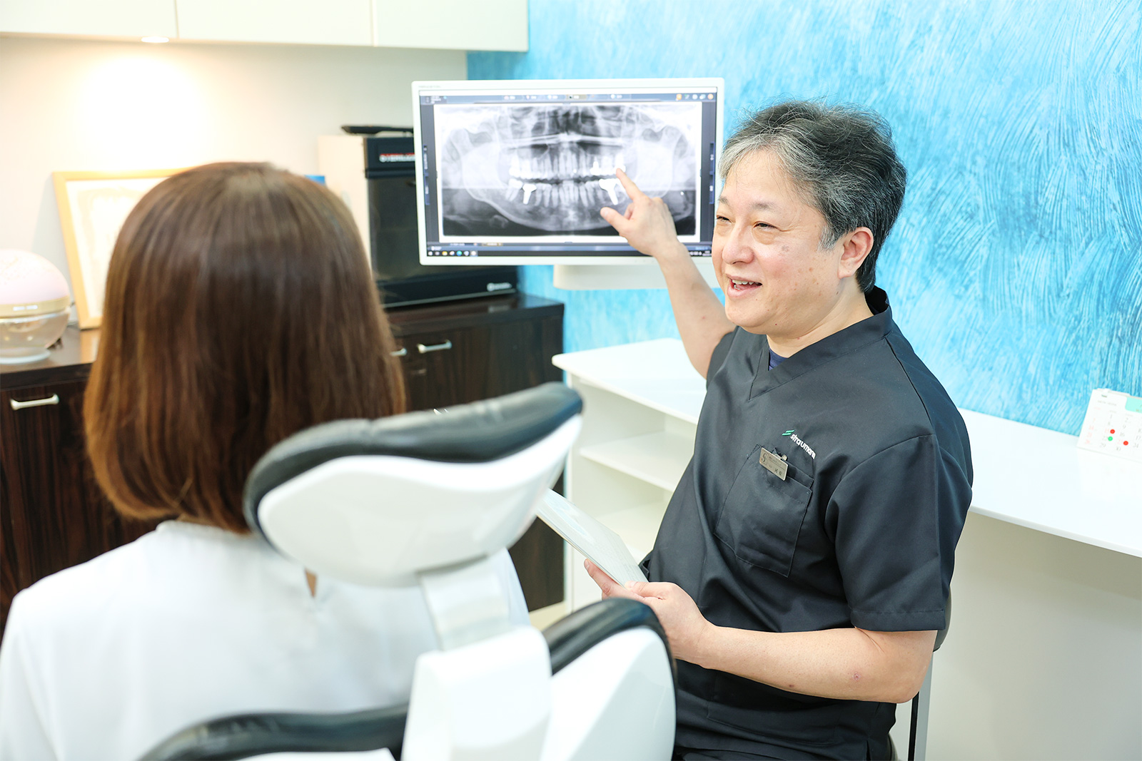 その後、カウンセリングの時間を設け、じっくりとお話を伺います。インプラント治療に対するご希望や不安、気になる点など、お気軽にご相談ください。レントゲン写真も踏まえて、最適な治療プランをご提案いたします。